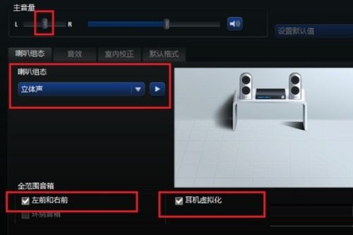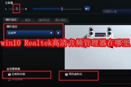 第三步:设置Realtek高清音频管理器喇叭组态,主音量设置为平衡。音量根据需要设置,设置为立体声。勾选左前和右前,如果带了耳机,可以勾选耳机虚拟化(如图所示)。