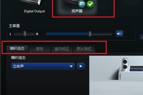 第二步:进去Realtek高清音频管理器界面之后,主要对扬声器进行设置。可以设置喇叭组态,音效,室内校正,默认格式四个方面(如图所示)。