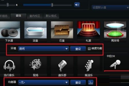 第四步:进行音效设置,音效主要设置环境和均衡器,这里环境设置为房间,均衡器设置为无,人声消除一般不勾选,卡拉ok设置为0(如图所示)。