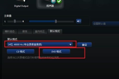 第六步:进行格式设置,选择DVD格式。这里设置的是24位,48000HZ。这样就设置完成了,设置音频管理器可以拥有更好的音质效果(如图所示)。