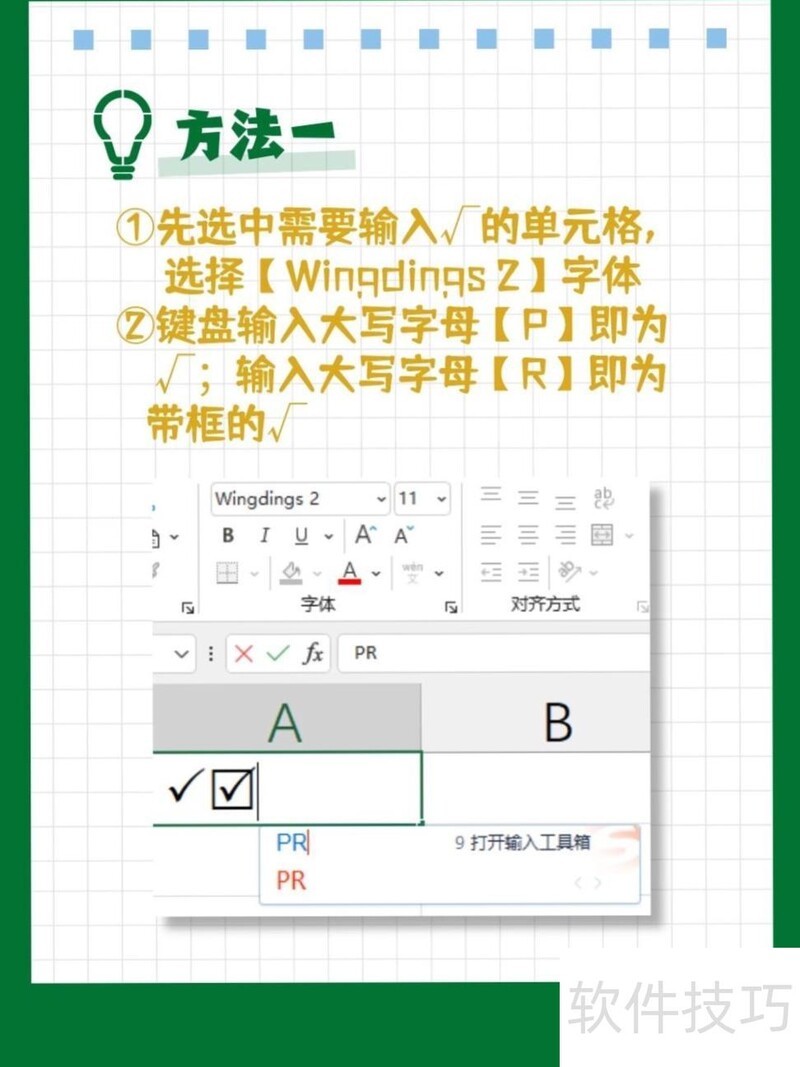 先选中单元格,设置字体为,输入即可显示√符号。