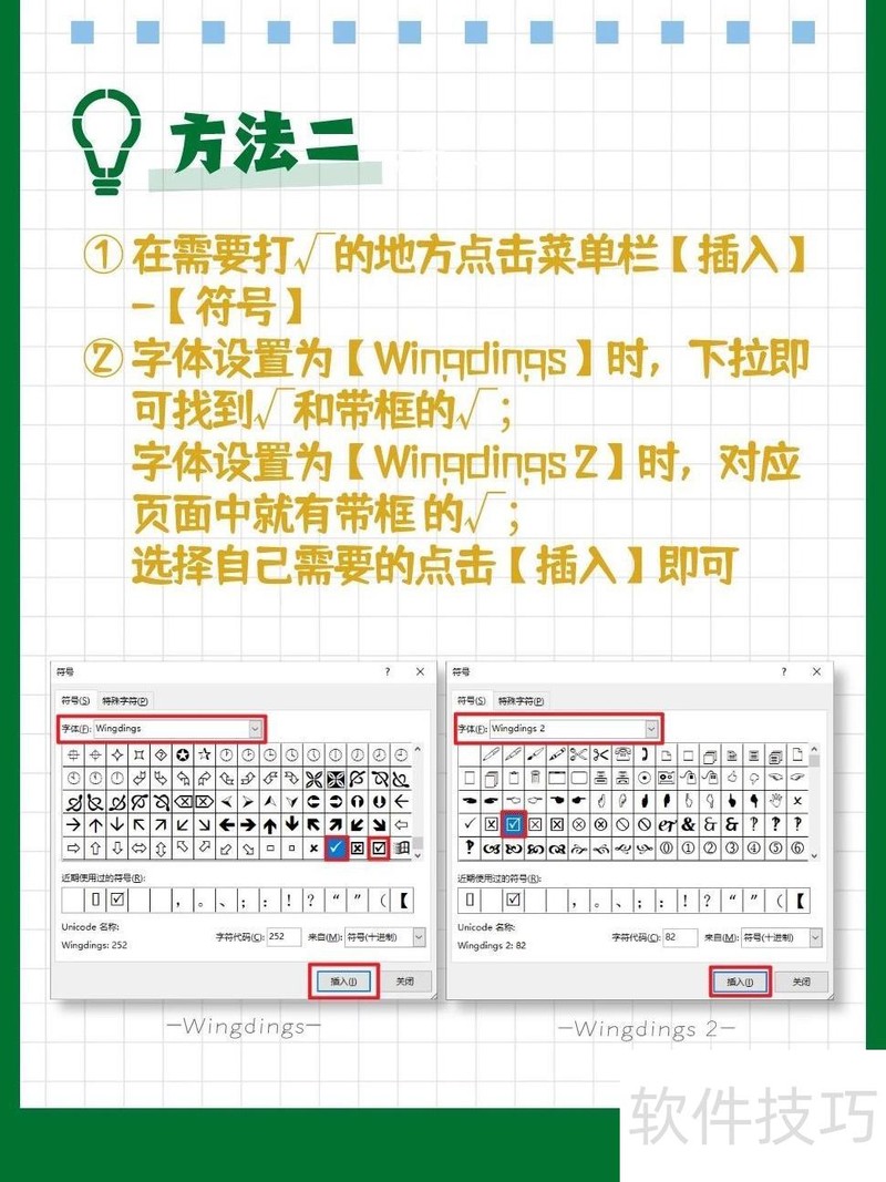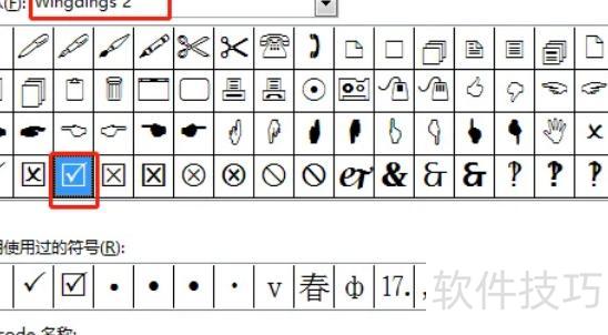 在弹出窗口中选择Wingding2字体,定位到带勾的方框符号,点击插入即可。