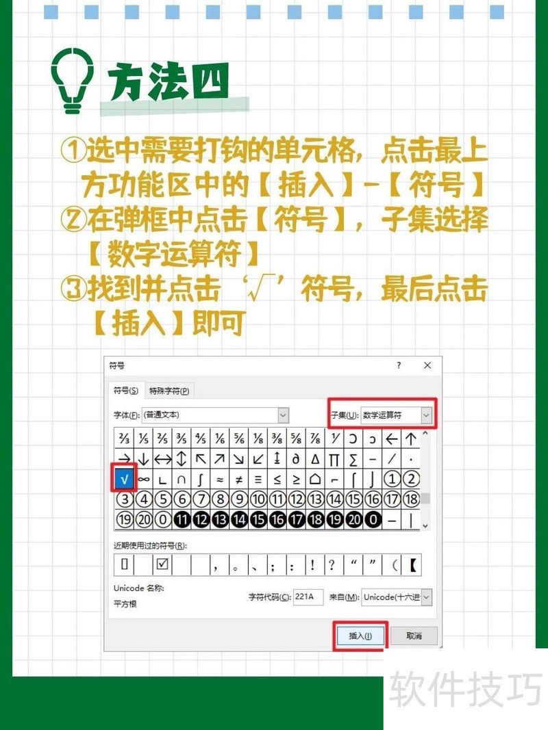 方法一:打开需输入符号的Excel文件,选中目标单元格。在开始选项卡右侧找到符号按钮,点击下拉箭头,选择符号大全中的符号选项。进入后切换至数学分类,找到勾选符号并插入,即可在选定单元格中显示勾号。
