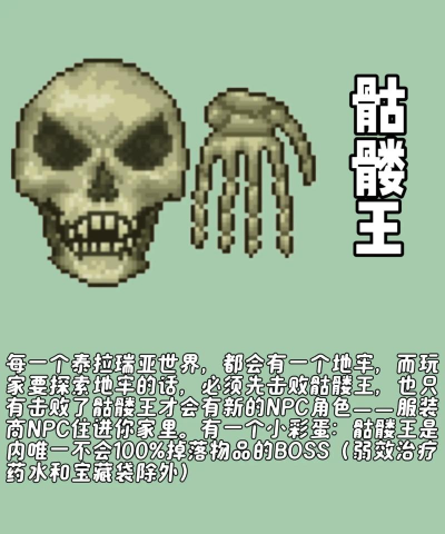 泰拉瑞亚骷髅王需在夜晚与地牢老人对话召唤,通常在击败肉山后出现。召唤后需在天亮前击败,否则会暴走并秒杀玩家。