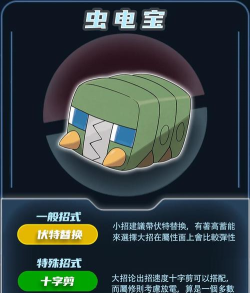 虫电宝拥有蓄电特性,能提升同伴宝可梦特殊招式的威力,技能池包括电磁波、伏特替换等,适合多种战斗策略。