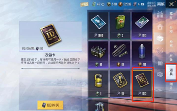 和平精英改名卡在哪里购买 1、打开游戏,等待进入游戏界面. 2、进入后,点击右边的「商城」. 3、然后再点击这里的「道具」. 4、点击这里的第二个箱子,上面的是礼品,不在那里的. 5、这里的第二张ID卡,就是改名卡了.点击选中它. 6、选中后,这里会显示出一个购买的按钮,点击它. 7、输入要购买的数量,就可以购买了.