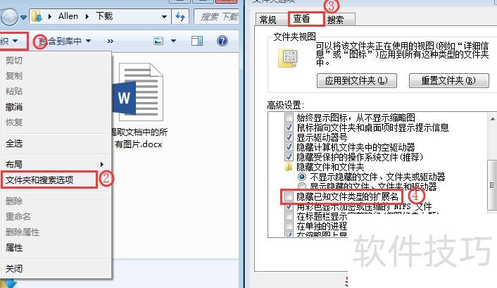 点击,从下拉菜单中选择,打开对话框后,切换至选项卡,取消勾选隐藏已知文件类型的扩展名选项,最后点击按钮,即可显示文件的扩展名。