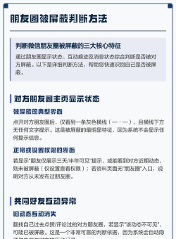 通过观察好友个人资料是否显示“朋友圈”字样或朋友圈显示一条横线,可初步判断是否被屏蔽。此外,转账测试也可辅助判断,提示“非好友”为删除,无提示则为屏蔽。