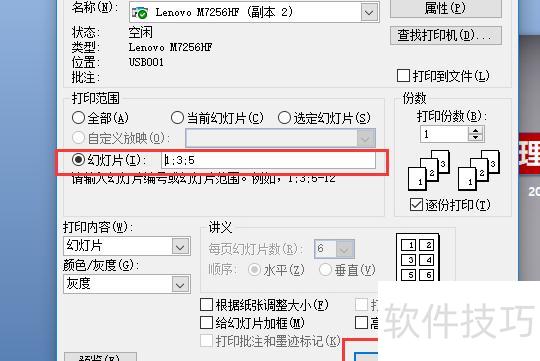 在打印对话框中选择幻灯片,输入需打印的奇数页码,如1、3、5等,确认无误后点击确定即可。