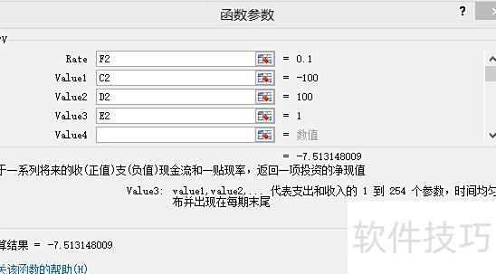 语法格式:NPV(折现率, 数值1, 数值2, …)。