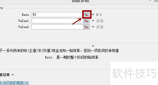 在弹出的函数参数框中输入数据,第一项为利率,对应表格F2单元格内容。点击Rate栏右侧的小图标选择数据,也可直接手动输入F2。