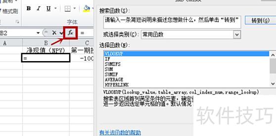 用鼠标点击净现值(NPV)下方空白处,然后点击fx,右侧将弹出函数选择框。