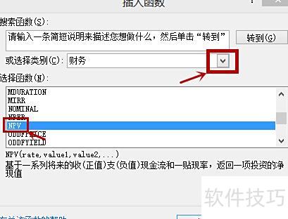 在类别中点击下拉箭头,选择财务,然后在函数列表中找到并选中NPV,最后点击确定。