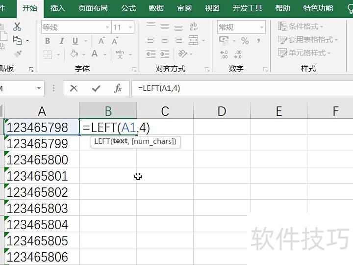 在B1单元格输入公式=LEFT(A1,4),表示从A1单元格内容的左侧开始提取前4个字符。