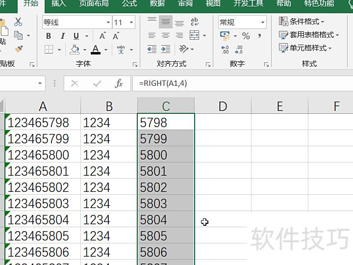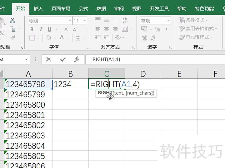 在C1单元格输入公式=RIGHT(A1,4),表示从A1单元格内容的右侧提取4个字符。