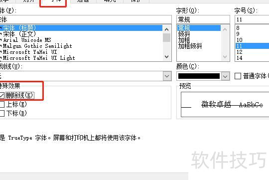 在弹出的渣框中选择字体,勾选特殊效果中的删除线,最后点击右下角确定。