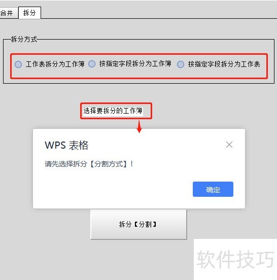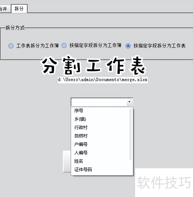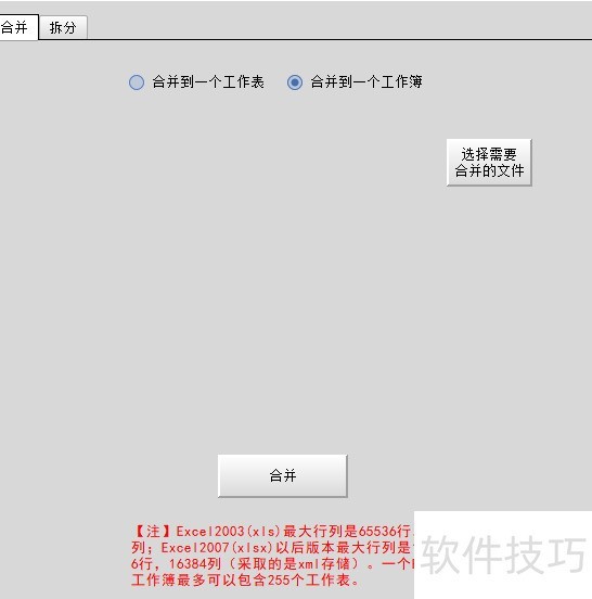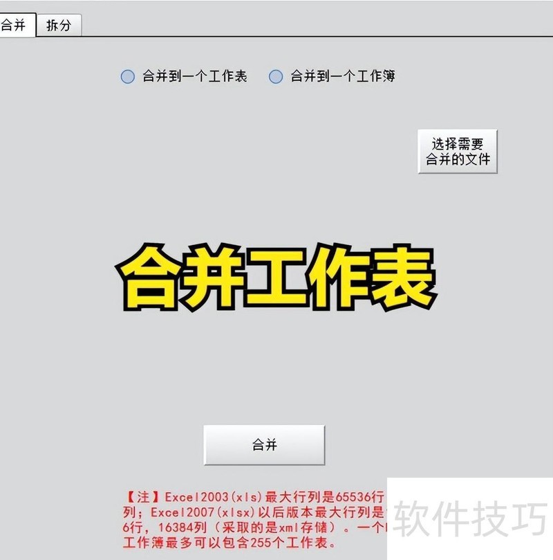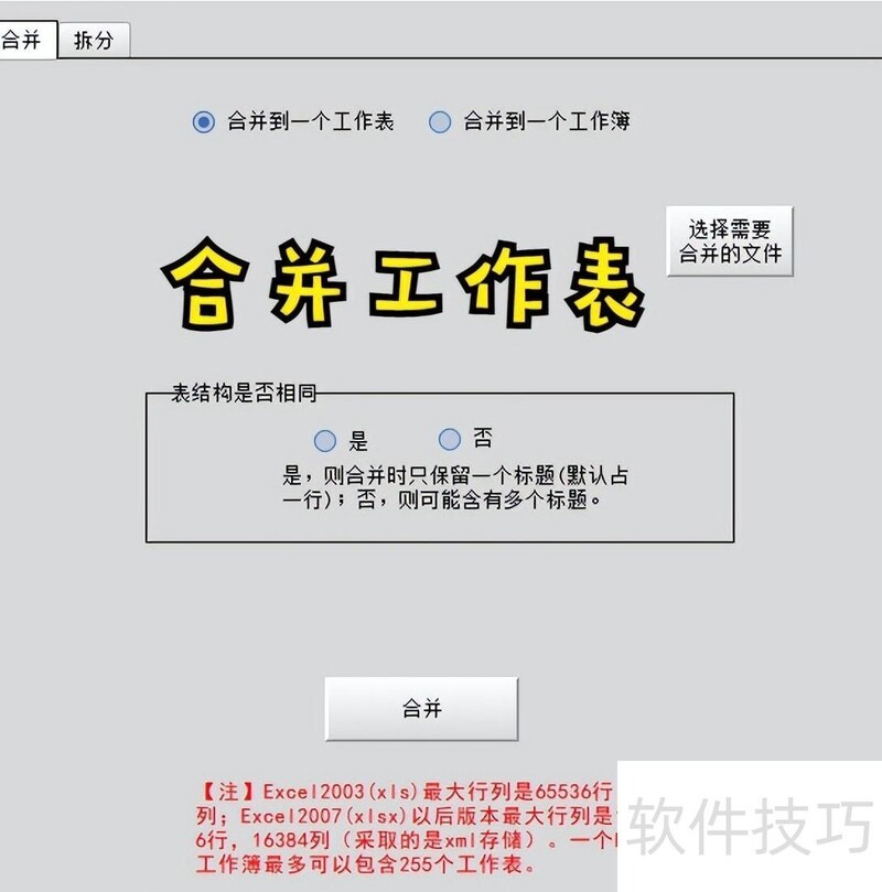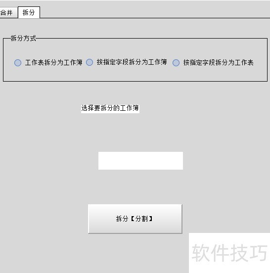 7. 合并主界面需校验合并文件,不同合并方式对应不同界面,导致界面显示不一致。二、拆分(分割)方式包括:按指定字段拆分为多个工作簿;按字段拆分为多个工作表;将单个工作簿中每个工作表分别拆为独立工作簿;按设定行数平均拆分为多个工作簿;以及按行数平均拆分为多个工作表,可依据拆分数量设定工作表或工作簿的个数。