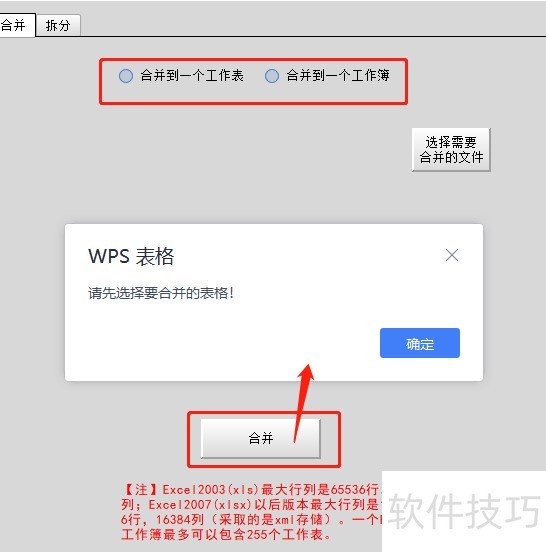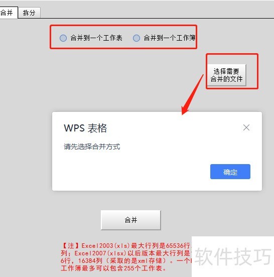 首先选择合并方式,然后选定需合并的文件(仅支持.xls、.xlsx、.et格式)。若所选文件仅含一个工作簿且该工作簿中只有一个工作表,则提示无需合并。