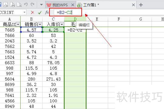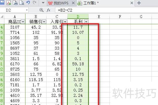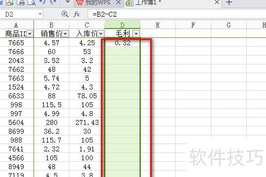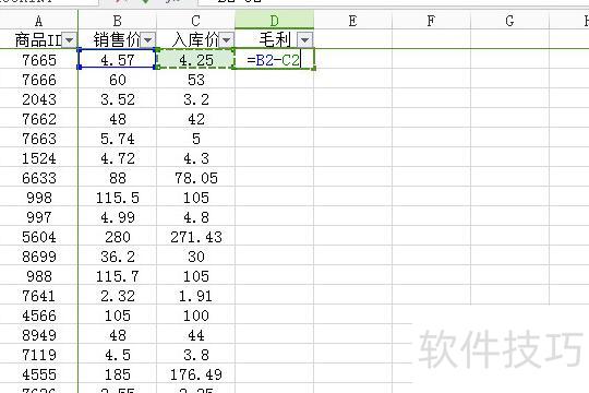 打开Excel文档,在D2单元格输入=B2-C2,计算第一个商品的毛利。