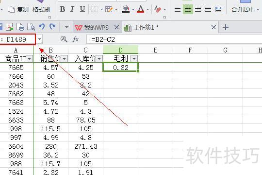 接着按回车键,D2单元格将显示毛利0.32。随后单击D2单元格,并在图示位置输入填充区域D2:D1489,完成区域设定。