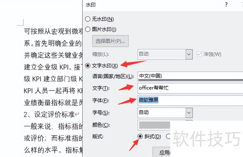 可选择文字水印,输入内容、字体,设置版式后点击确定。