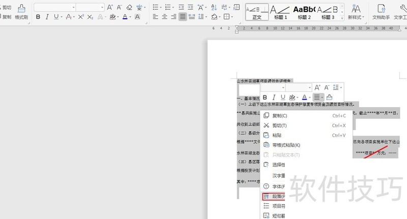 选中文字后右键点击,选择段落选项。