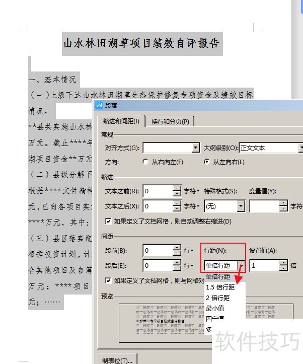 点击行距下拉菜单,选择单倍行距(可自定义)。