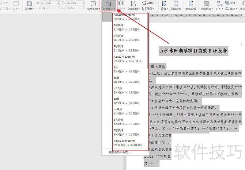 2、点击纸张大小,根据需求选择合适尺寸,通常选用A4较为普遍。