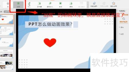 单击动画后,将显示多种效果选项,如出现等动画形式。