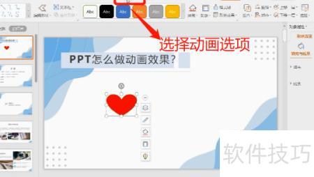 打开PPT,选中目标对象,点击上方工具栏中的选项,即可在下方选择所需的动画切换效果。