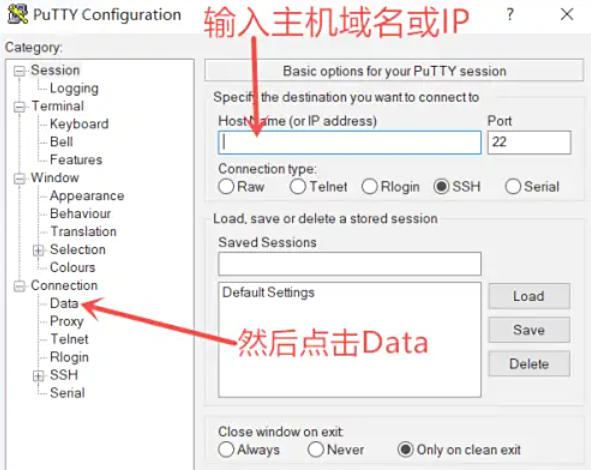 打开 PuTTY,在 Host Name (or IP address) 输入服务器地址(如 192.168.1.100 或 example.com)。