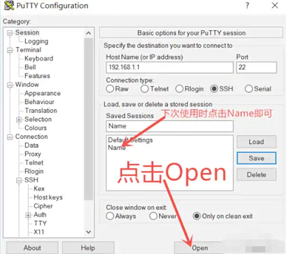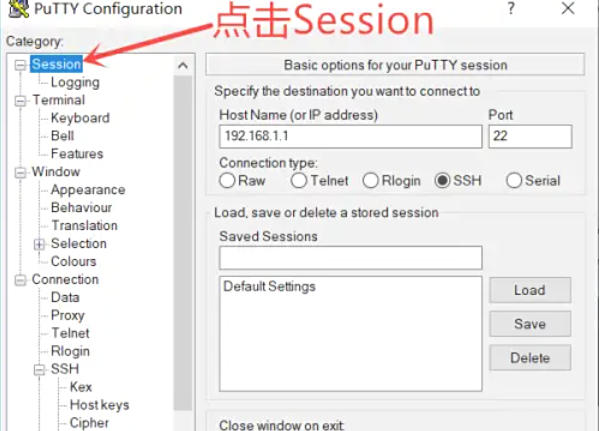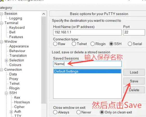 返回左侧导航栏顶部,选择 Session。在 Saved Sessions 输入会话名称(如 MyKeyServer)。点击 Save,下次可直接双击加载配置。