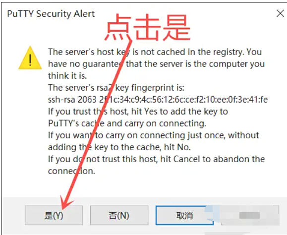 点击 Open,弹出终端窗口。首次连接会提示 “Server’s host key is not cached”,