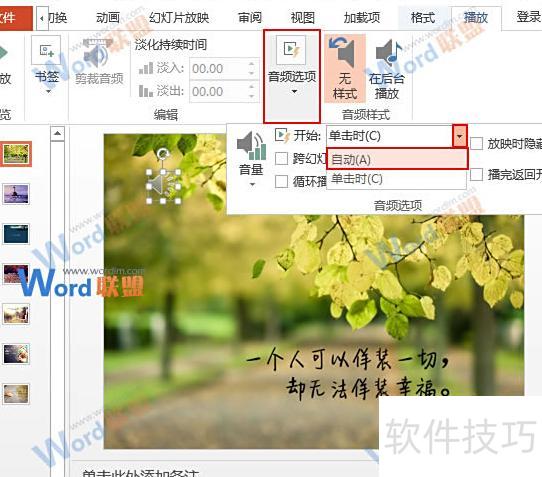 将音频图标移至所需位置,通常为PPT左上方,点击音频选项组中开始右侧下拉按钮,选择自动即可。