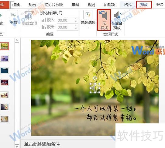 返回文稿后,可见第一张PPT中央已插入音频图标,幻灯片自动跳转至音频工具→播放选项卡,且显示为无样式。