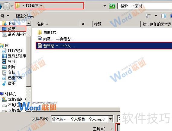 此时会弹出播放音频窗口,浏览并选择要用作背景音乐的文件,比如位于桌面的PPT素材文件夹中的曾沛慈 - 一个人想着一个人.mp3,选中后点击插入按钮即可完成操作。