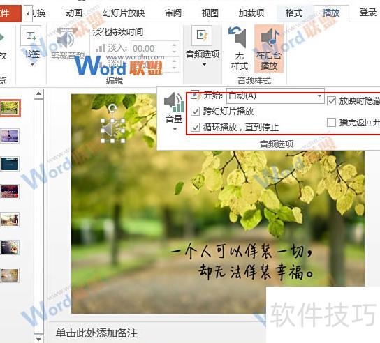 最后勾选跨幻灯片播放、循环播放和放映时隐藏选项,放映时即可听到背景音乐。