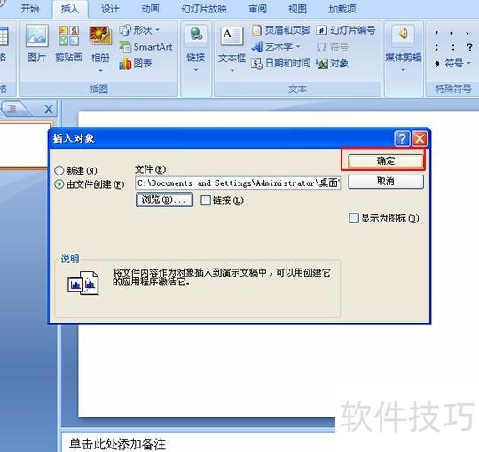 返回插入对象对话框,文件路径已显示在条形框内,点击确定按钮即可关闭该窗口。