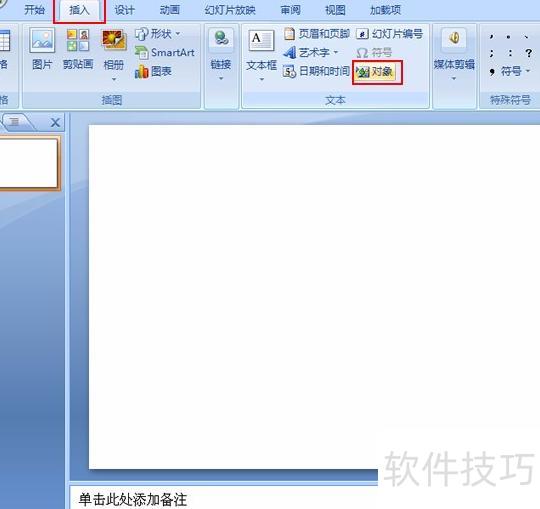 在需插入表格的幻灯片中,点击插入选项卡下的文本组中的对象按钮。