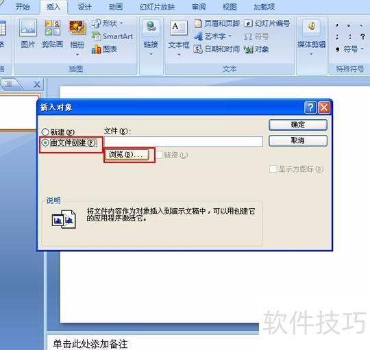 弹出插入对象窗口后,选择由文件创建,点击浏览按钮进行文件选取。