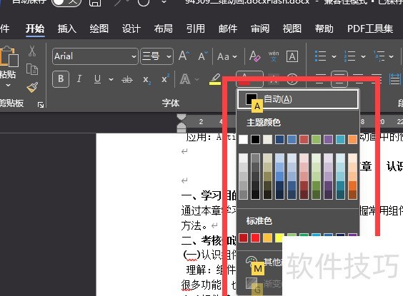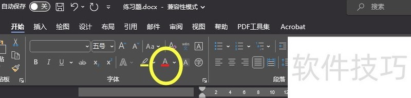 可参考上图中箭头所指的A图标,其下方带有色彩块,点击后下拉菜单将显示色板,选择所需颜色即可。