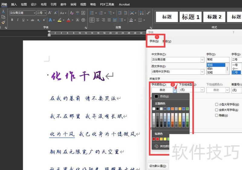 点击字体后,弹出字体对话框,默认进入字体选项卡,中间显示字体颜色,点击下拉按钮展开色板,从中选择所需颜色即可。