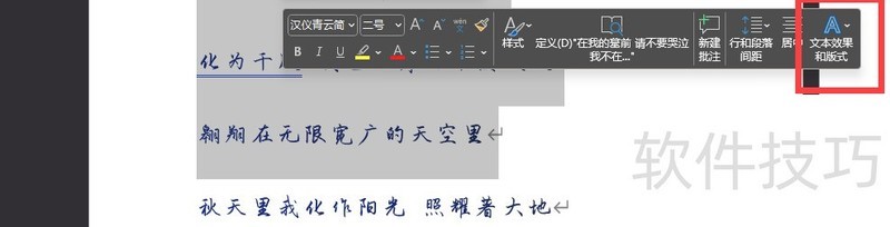 用鼠标左键选中需更改颜色的文本,1所示,浮动快捷工具栏最右侧最大的A图标即为文本效果与版式设置选项。