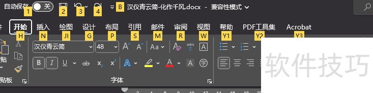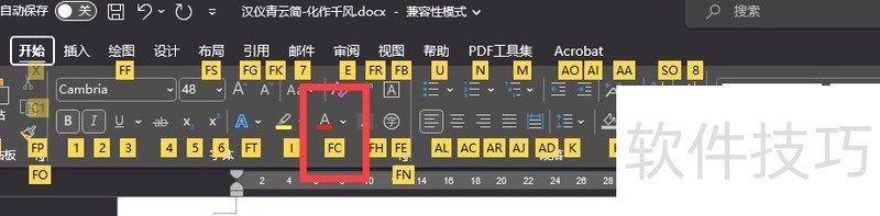 再次点击H后,你会发现即使未按alt键,功能按钮的标签也会显示出来。例中设置文字颜色的按钮,其快捷标签为FC,此时只需依次按下F和C即可执行相应操作。