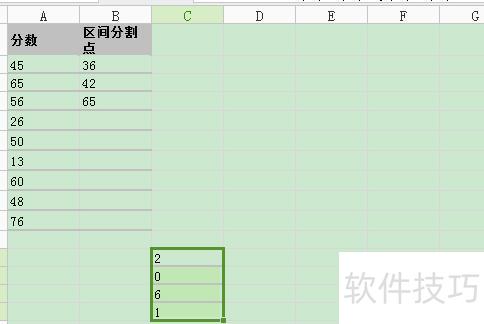 A列数据以36、42、65为分界点,划分为四个区间,所示。