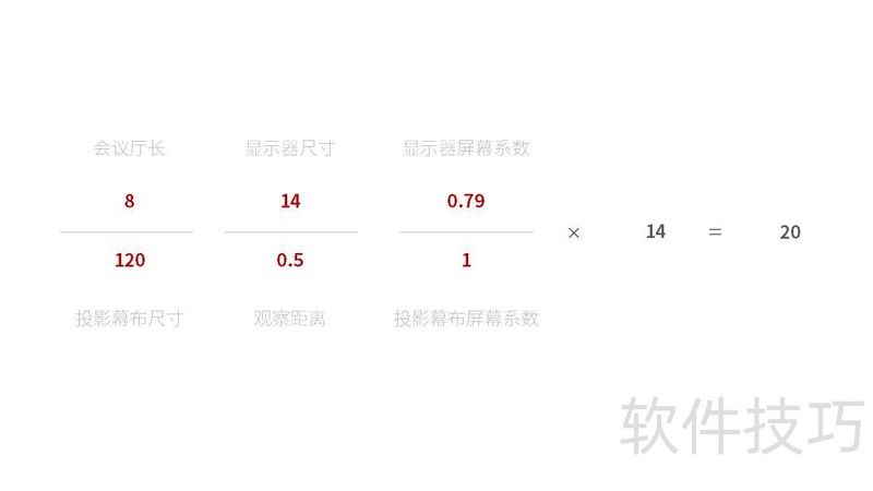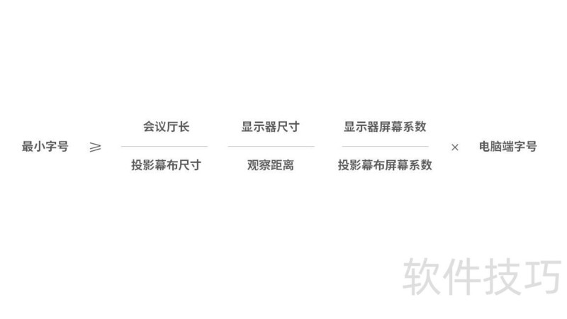假设你的电脑是14英寸、16:9屏幕,会议厅长8米,使用120英寸、4:3的投影幕。当你坐在距屏幕0.5米处查看PPT中14号字时,其视觉大小相当于会议厅最后一排观众观看投影上特定字号文字的大小。该投影环境下的实际可读性取决于投影分辨率与字体大小的对应关系。