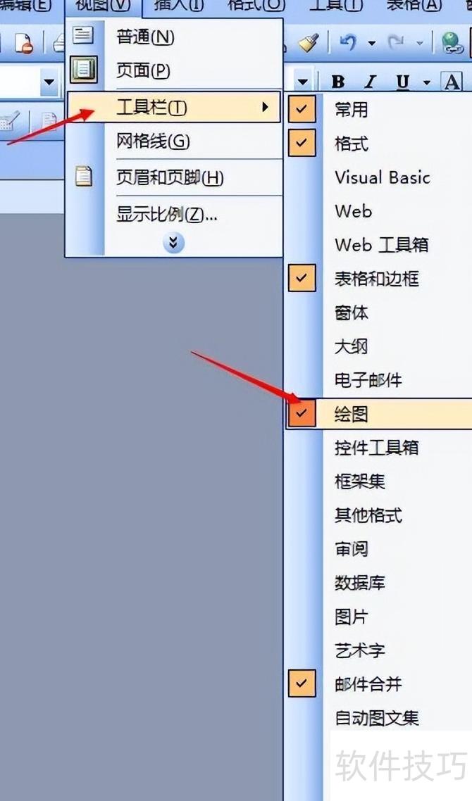 3.1 打开Word,选择视图菜单下的工具栏,勾选绘图,即可在页面底部显示绘图工具栏。