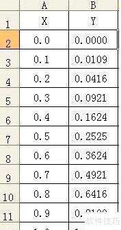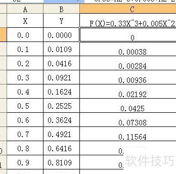 步骤6:通过Excel表格及公式拖动计算原函数值。如表2所示,在单元格C2中,于编辑栏输入公式=0.33*A2^3+0.005*A2^2并按回车确认。随后将鼠标移至C2单元格右下角,待光标变为+号时,按住左键向下拖动至C12单元格,系统将自动填充对应行的函数值。由此可依次得到F(0)、F(0.1)、F(0.2),直至F(1.0)的计算结果。需注意,C1单元格仅作为列标题,不参与计算,所有公式必须引用对应数据所在单元格,确保计算准确无误。