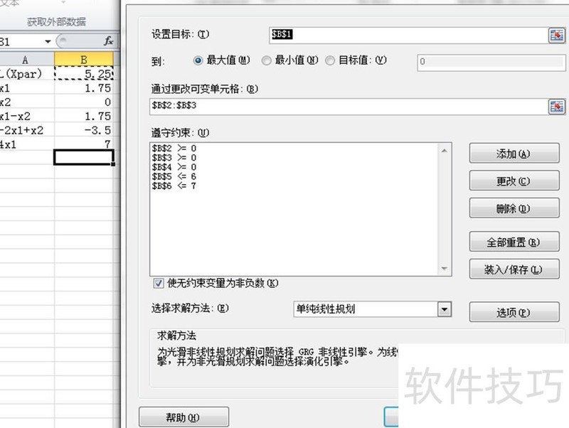 打开规划求解,设置B1为目标单元格,并选择最大化。