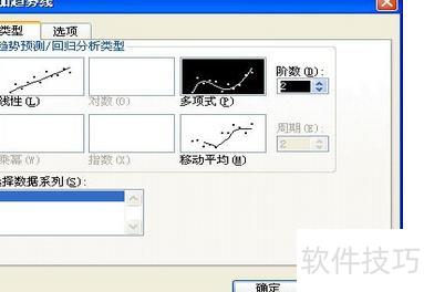 步骤3:打开对话框,切换至类型选项卡,在趋势预测/回归分析类型中,根据题目要求及积分计算需要,选择多项式类型,并将阶数设为2,也可根据曲线与数据点的拟合情况适当调整,4所示。